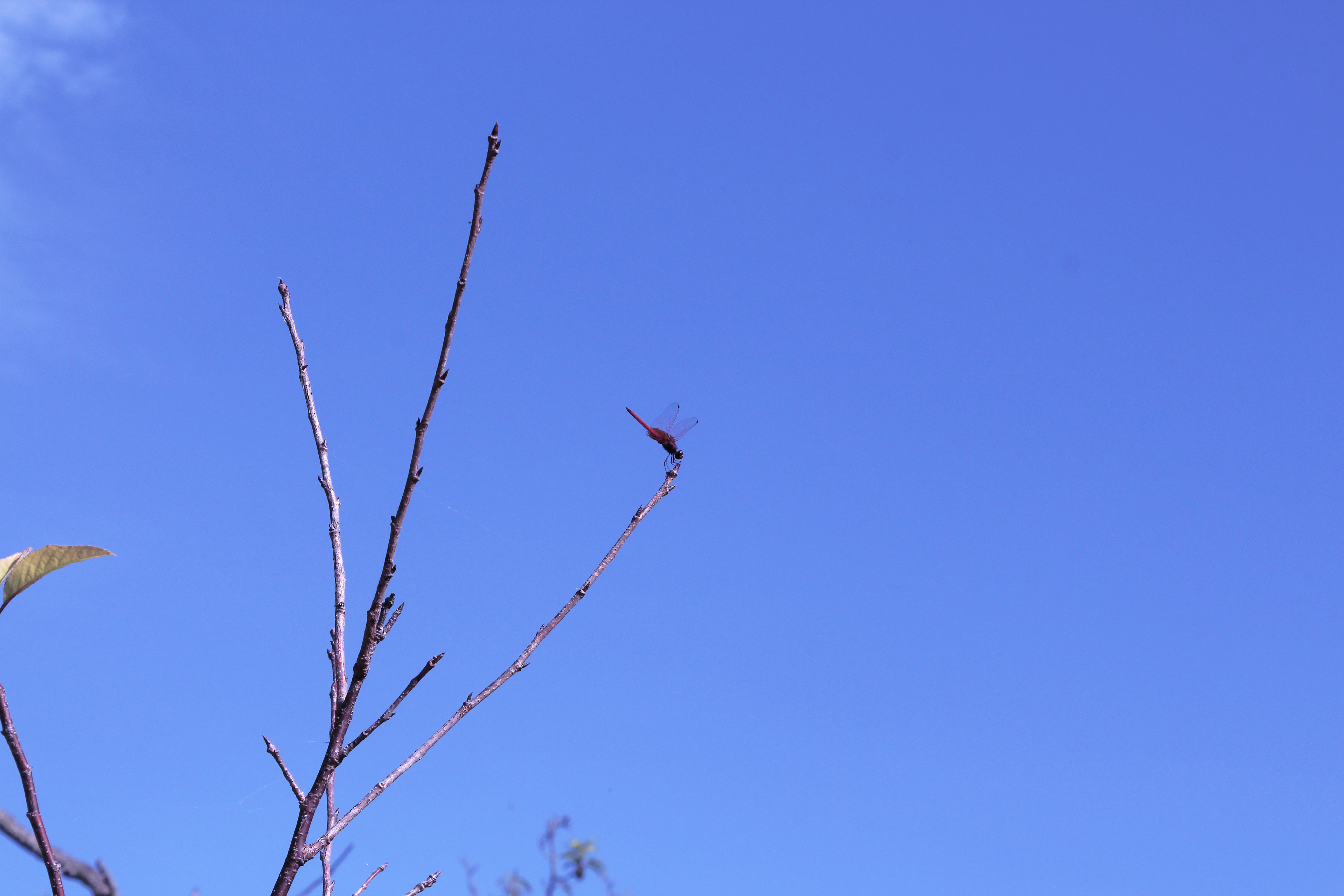 枝に止まった赤とんぼの写真です。